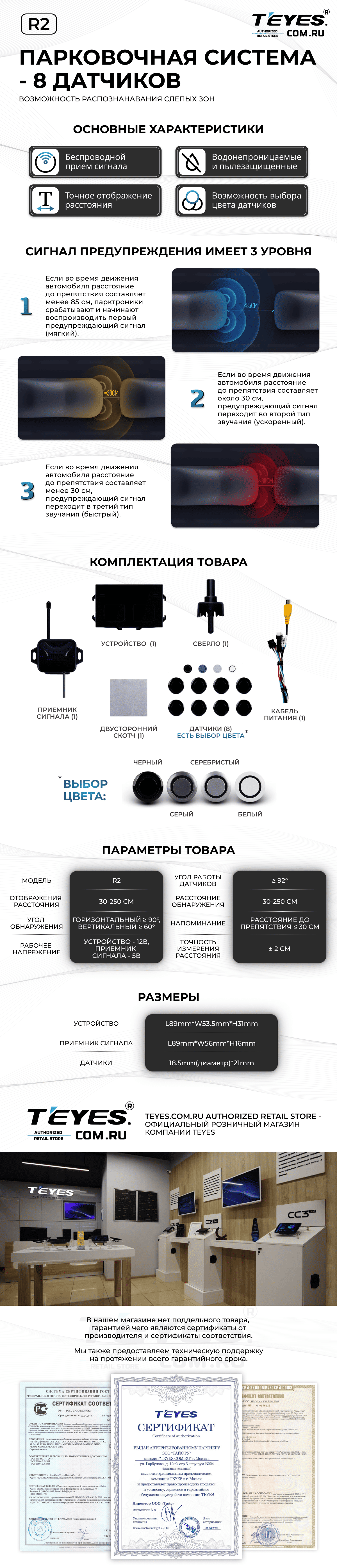 Передние и задние парктроники Teyes R2 для CC4 Pro / CC4 / CC4L / CC3 2K / CC3 / CC3L / CC2 Plus / SPRO Plus / TPRO2 / LUX ONE (Белые) 8-датчиков - купить всего за 19 900 руб. в интернет-магазине в Орле Teyes.com.ru. ✓ Самый лучший выбор мультимедиа ✓ Лучшая замена штатному ГУ ✓ Тел. +7 (800) 775-31-74