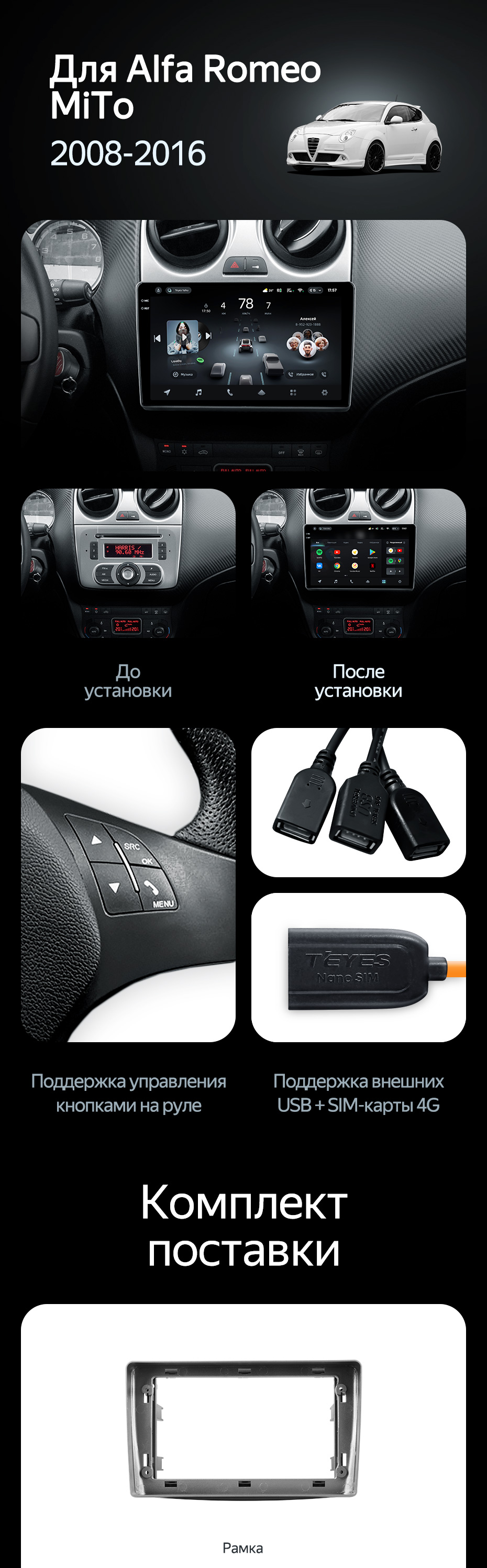 Штатная магнитола Teyes CC4 6/64 Alfa Romeo MiTo 955 (2008-2016) - купить всего за 50 500 руб. в интернет-магазине в Орле Teyes.com.ru. ✓ Самый лучший выбор мультимедиа ✓ Лучшая замена штатному ГУ ✓ Тел. +7 (800) 775-31-74