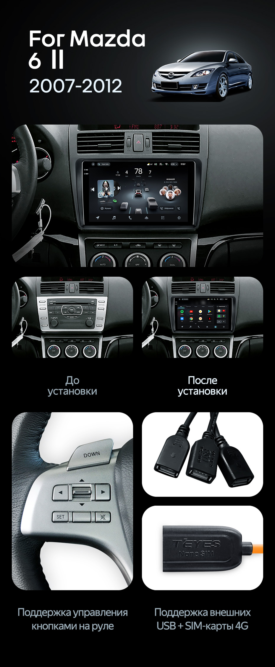 Штатная магнитола Teyes CC4 Pro 12/256 Mazda 6 2 GH (2007-2012) - купить всего за 66 220 руб. в интернет-магазине в Орле Teyes.com.ru. ✓ Самый лучший выбор мультимедиа ✓ Лучшая замена штатному ГУ ✓ Тел. +7 (800) 775-31-74