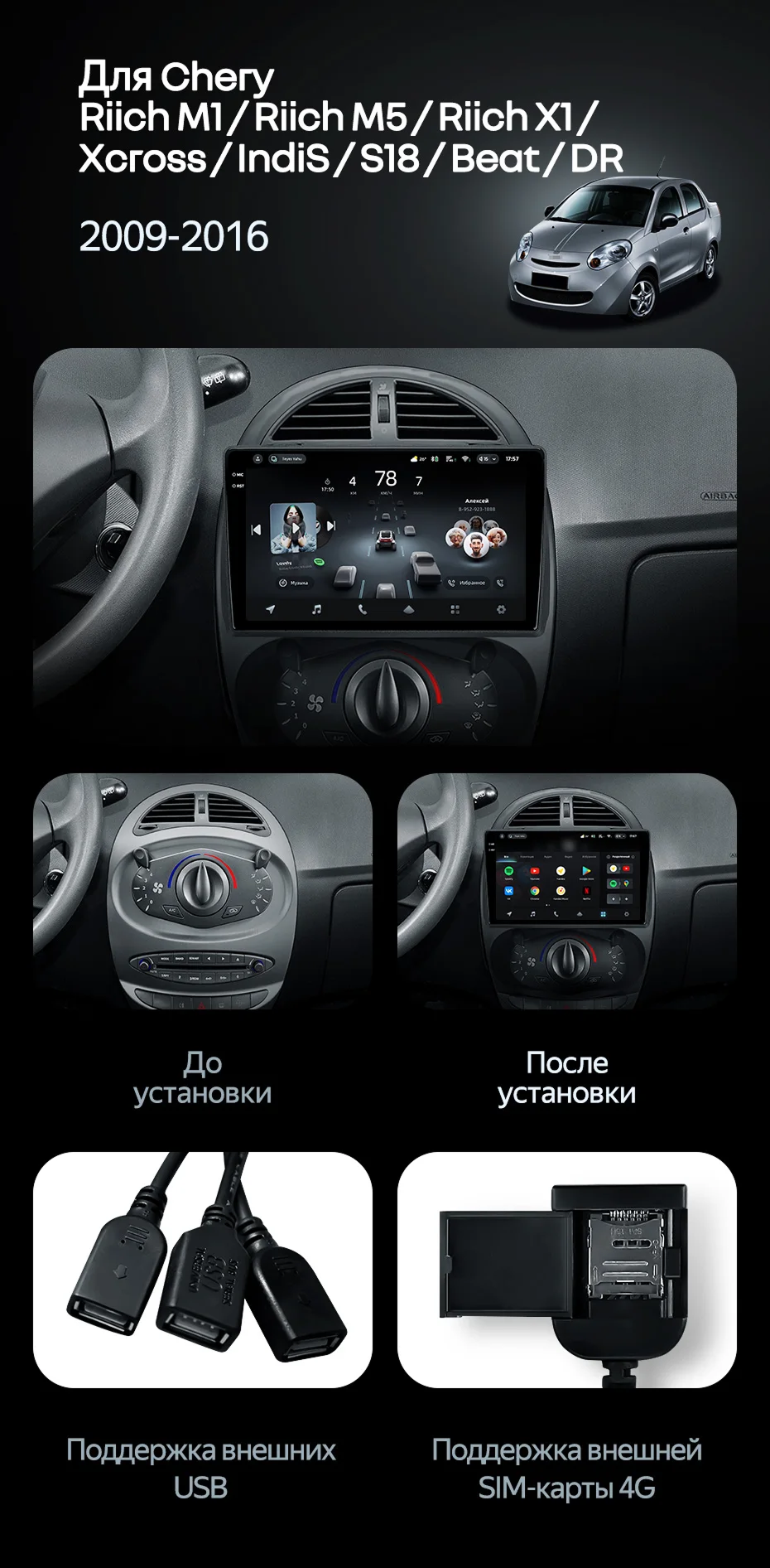 | USB | 3×USB 2.0 + USB 3.0 | Доп. аксессуары | Передняя/задняя AHD-камера, DVR-регистратор, TPMS, парковочный OBD, Type-C → HDMI |