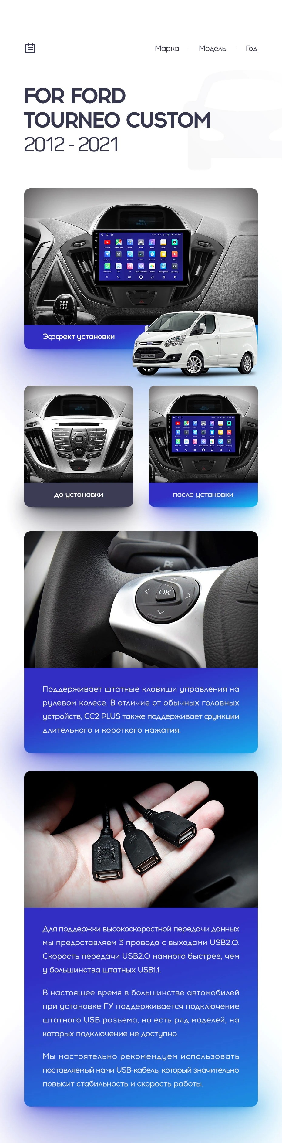 Полный комплект установки магнитолы Teyes с рамкой и проводкой можно выбрать в каталоге штатных магнитол Ford Transit (2012-2021).