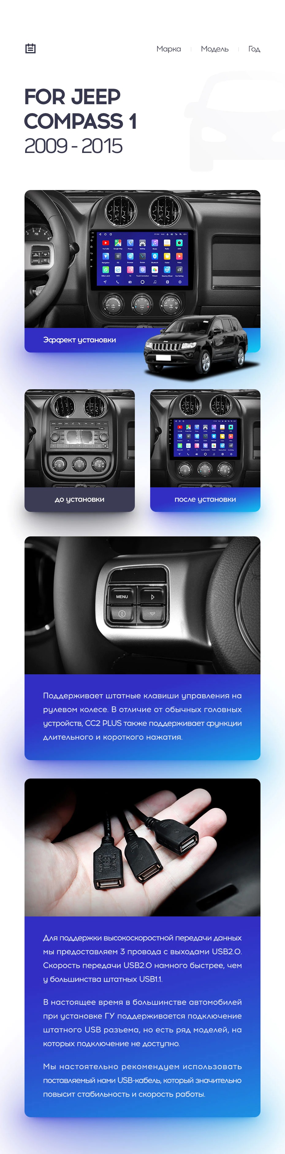 Полный комплект установки магнитолы Teyes с рамкой и проводкой можно выбрать в каталоге штатных магнитол Jeep Compass 1 MK (2009-2015).