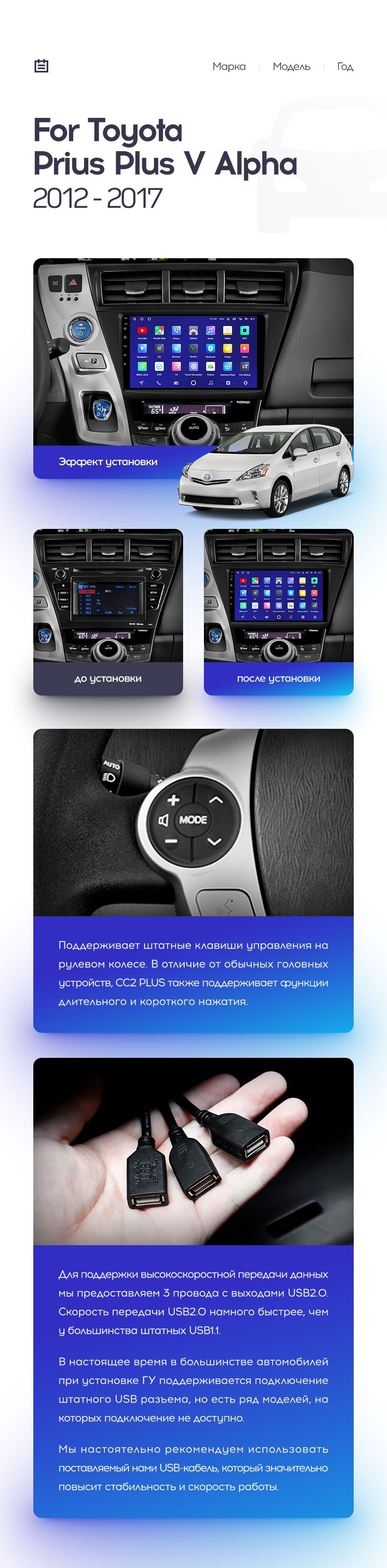 Установочный комплект для Toyota Prius Plus V Alpha LHD RHD (2012-2017) включает переходную рамку и проводку.
