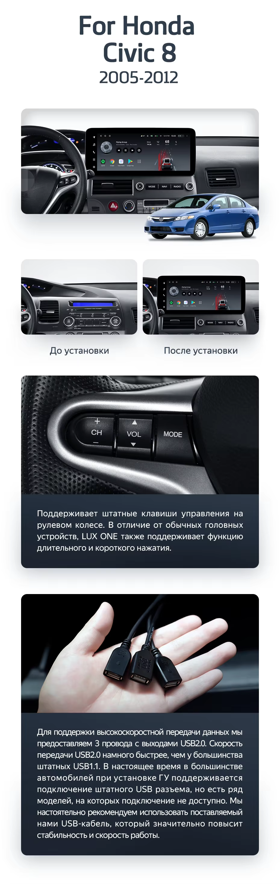 Установочный комплект для Honda Civic 8 FK FN FD (2005-2012) включает переходную рамку и проводку.