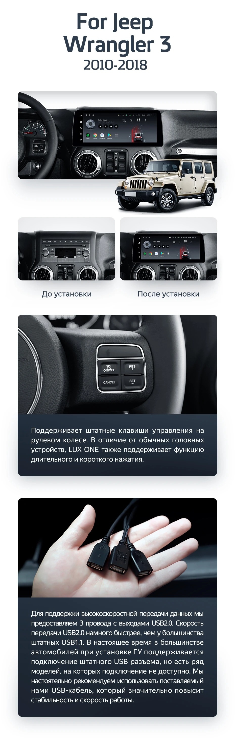 Установочный комплект для Jeep Wrangler 3 JK (2010-2018) включает переходную рамку и проводку.