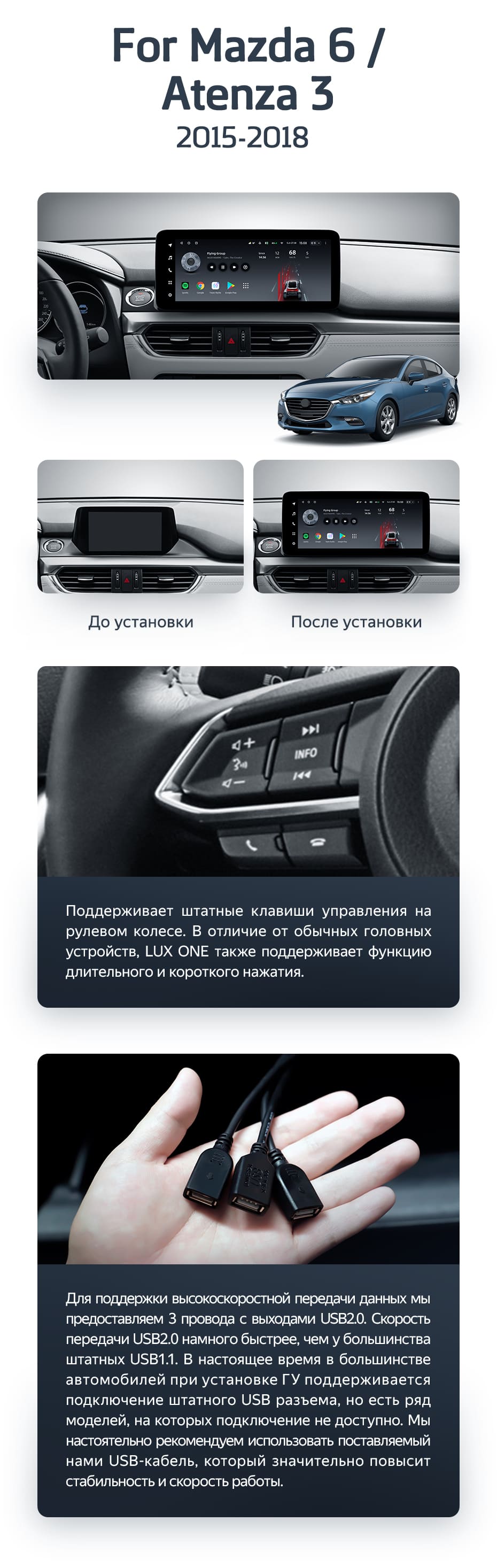 Полный комплект установки магнитолы Teyes с рамкой и проводкой можно выбрать в каталоге штатных магнитол Mazda 6 GJ GL (2015-2018).